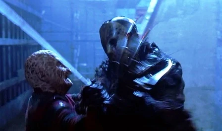 Freddy Krueger decided to take measure at this time. Taking advantage of highly intoxicated stoner, Bill Freeburg, Freddy took possession of his body and procured two needles filled with an extremely powerful tranquilizer. He waited in a corridor for Jason to come after him. When Voorhees approached, Krueger/Freeburg stabbed both needles into his neck. Before the tranquilizer could take effect, Jason cut Freeburg in half at the waste with one strong swing of his machete.